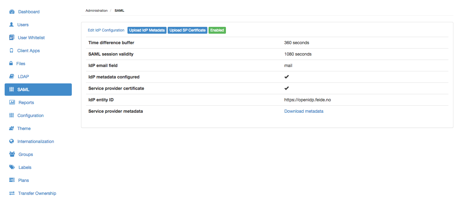 Indicates whether or not the IdP's metadata file has been uploaded and configured in the Covata Platform. This file is one of the requirements (described above) for configuring an IdP service on the Covata Platform.