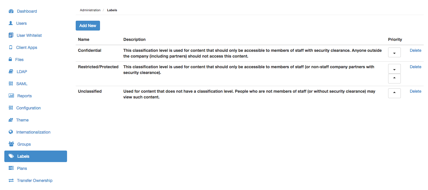 The Labels page allows Covata Platform administrators to define a set of labels from which Covata users can choose when sharing files with other people using Safe Share applications, including other client applications utilizing the Covata Platform's API.