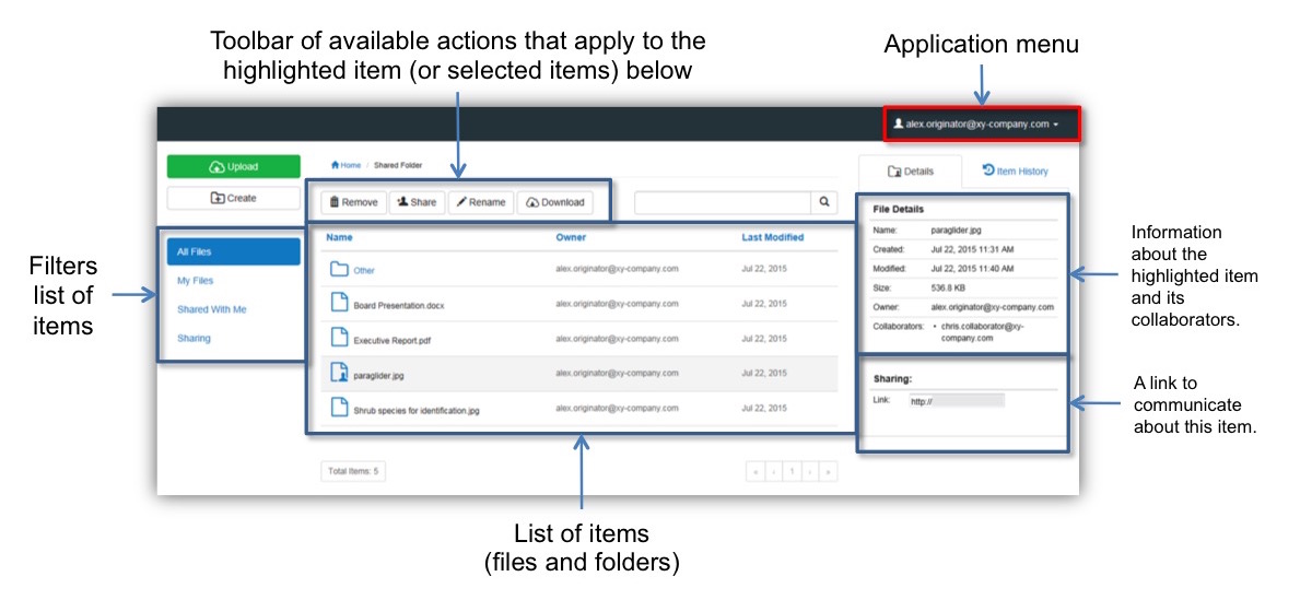 Functional overview of the main Safe Share page