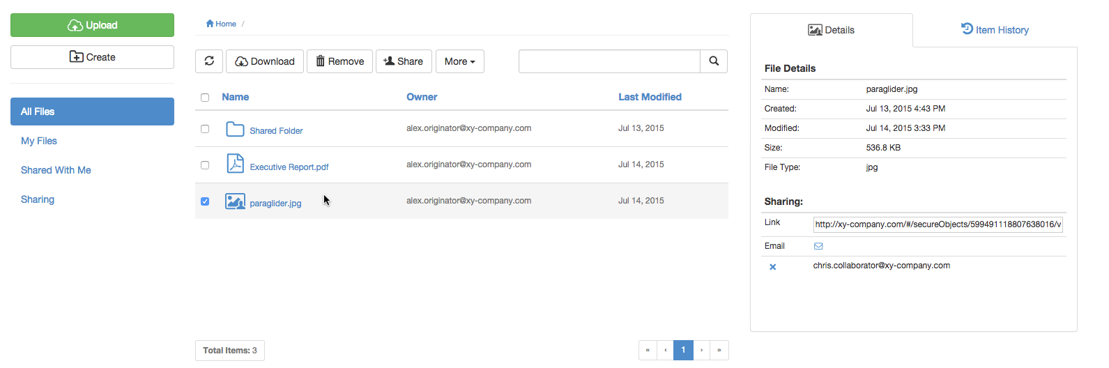 The Safe Share web application prompts you to confirm this removal and upon clicking Yes, your access to this item is removed and the item is removed from your list of items area.