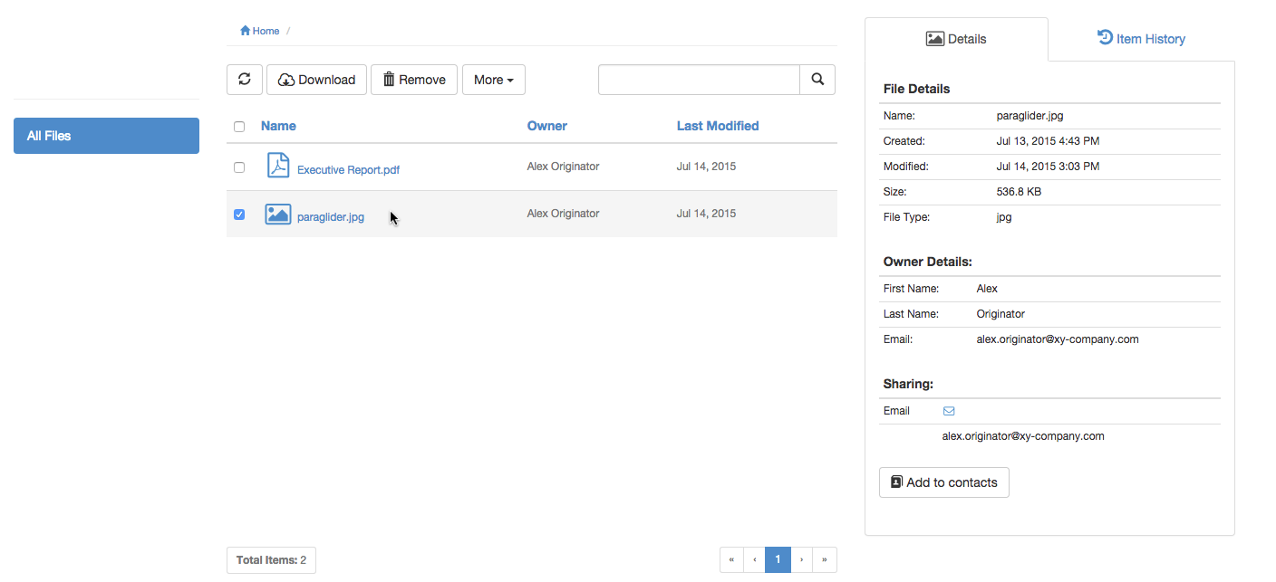 Note: If your user account does not have the Originator role, then you do not have your own storage space to upload, securely store and share personally owned content using Safe Share. Therefore, only the All Files filter is shown.