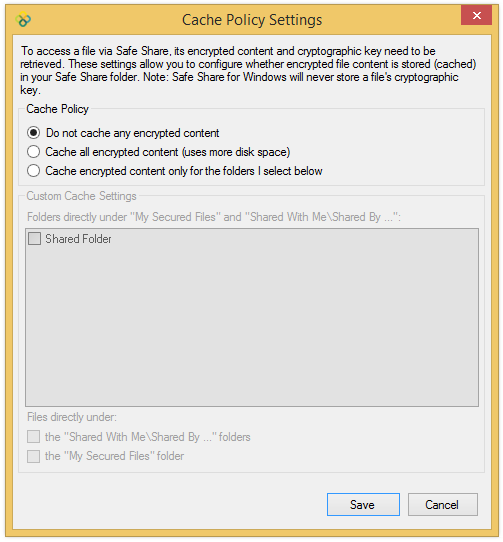 Safe Share folders) being retained, such that whenever any file's encrypted content needs to be decrypted, its content does not need to be downloaded from remote storage. Safe Share folders) whose encrypted content is not (yet) stored locally, will be downloaded and subsequently cached when you next decrypt that file. Safe Share subfolders (My Secured Files and Shared With Me) will retain encrypted content. My Secured Files folder and content will be absent from this dialog box. My Secured Files and Shared With Me\Shared By ... are listed in the box. Therefore, choosing one of these folders makes Safe Share for Windows cache every file contained within this folder, including all of its subfolders. My Secured Files and Shared With Me\Shared By ... will be clear (i.e. not cache any encrypted content) until you explicitly set these folders to do so through this dialog box. Shared By ... folder contained within the Shared With Me subfolder. My Secured Files subfolder.