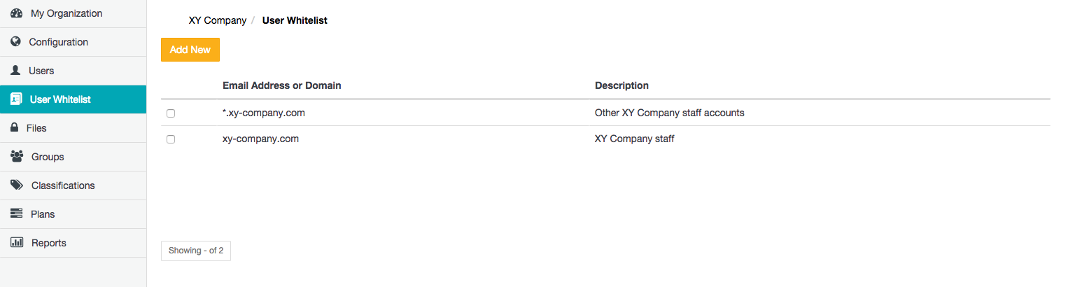 An Organization administrator can configure and manage the user whitelist, which defines the people that can be shared items by other Covata users within the administrator's organization.