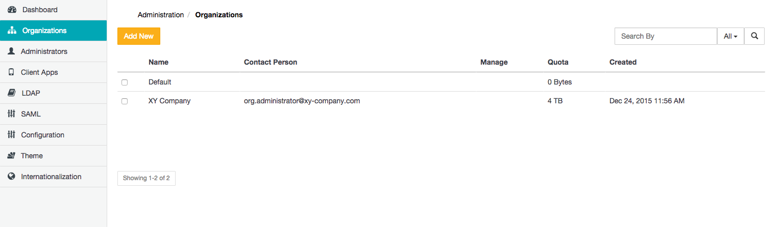 When first using Safe Share Administration on either a newly-installed Covata Platform instance or one which has been upgraded from version 2.16 (or earlier), one organization is present:
