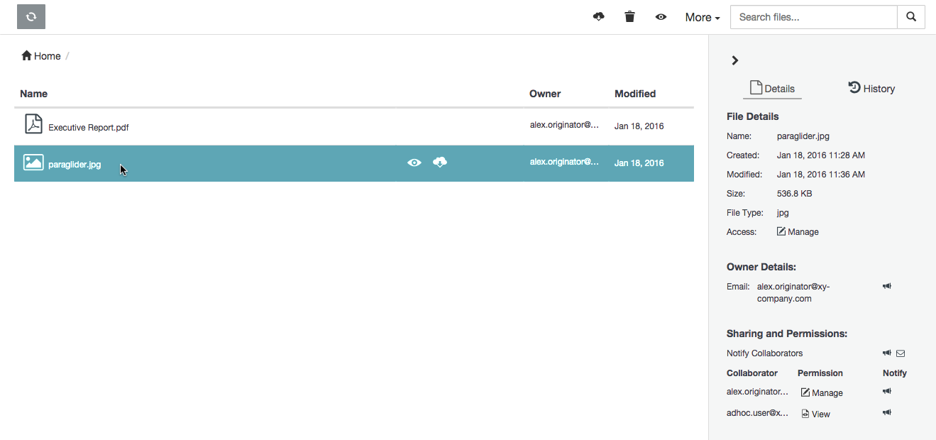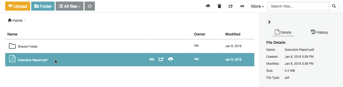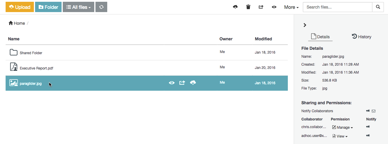 Locate the personally owned file or folder (which you or a collaborator had previously uploaded/created). Tip: To ensure you are only working with your own items in the list of items area, click the All files drop-down at the top-left of the main Safe Share page and choose the My filesfilter.