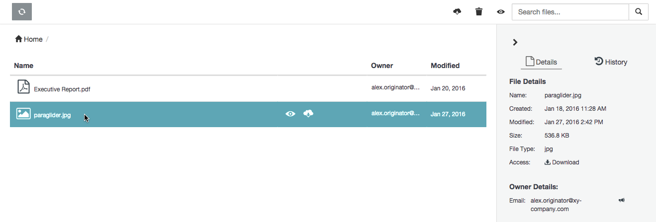 Note: If your user account does not have the Originator role for your (current) organization, then the All files (and other filters) drop-down will not be available because you do not have your own storage space to upload, securely store and share personally owned content within this organization.