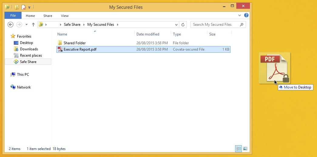 Select the item/s and drag/copy/move them to a location outside the Safe Share folder; for example, dragging them to your desktop: Note: Regardless of whether you copy or move items from My Secured Files, the secured items will remain in the My Secured Files subfolder. OR