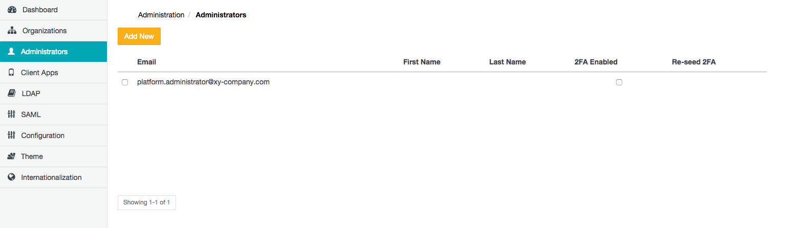 | 2FA Enabled (2) and Re-seed 2FA | The 2FA Enabled field's check box for a Safe Share administrator's account is selected if that user has two-factor authentication (2FA) enabled on their account. (This field is also editable through the user's own My Account feature.) If this check box is selected for a Safe Share administrator's account, then the Re-seed button becomes available for that account in the Re-seed 2FA column/field. If a Safe Share administrator account does not have 2FA enabled, this field's check box is cleared for their account. The state of 2FA being enabled or disabled for Safe Share administrator accounts other than your own is only visible on the Administrators page. | No |