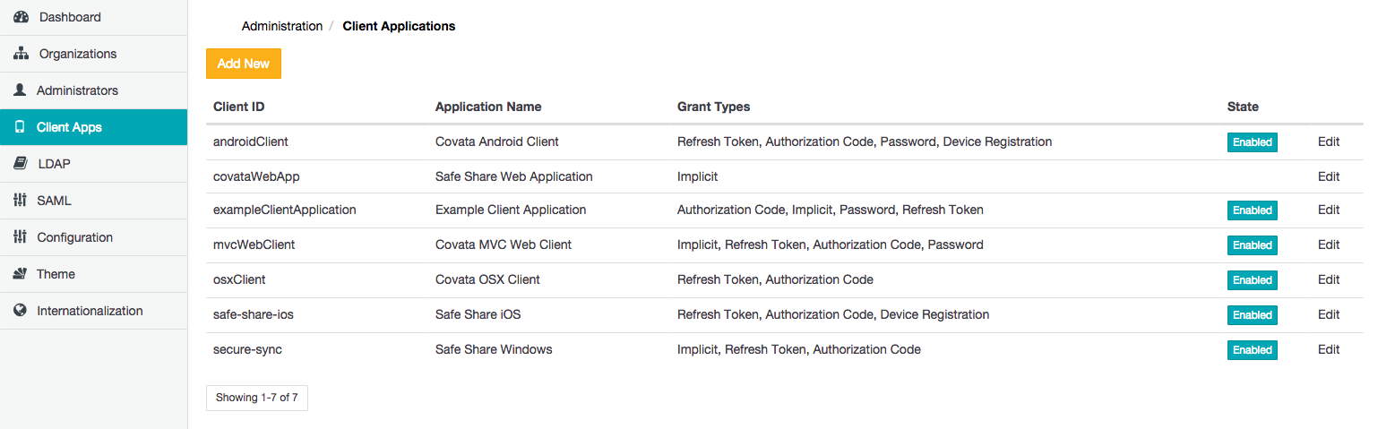 Note: When a client application is disabled it can still be edited. This feature allows a registered client application to be configured before access to the Covata Platform is enabled.