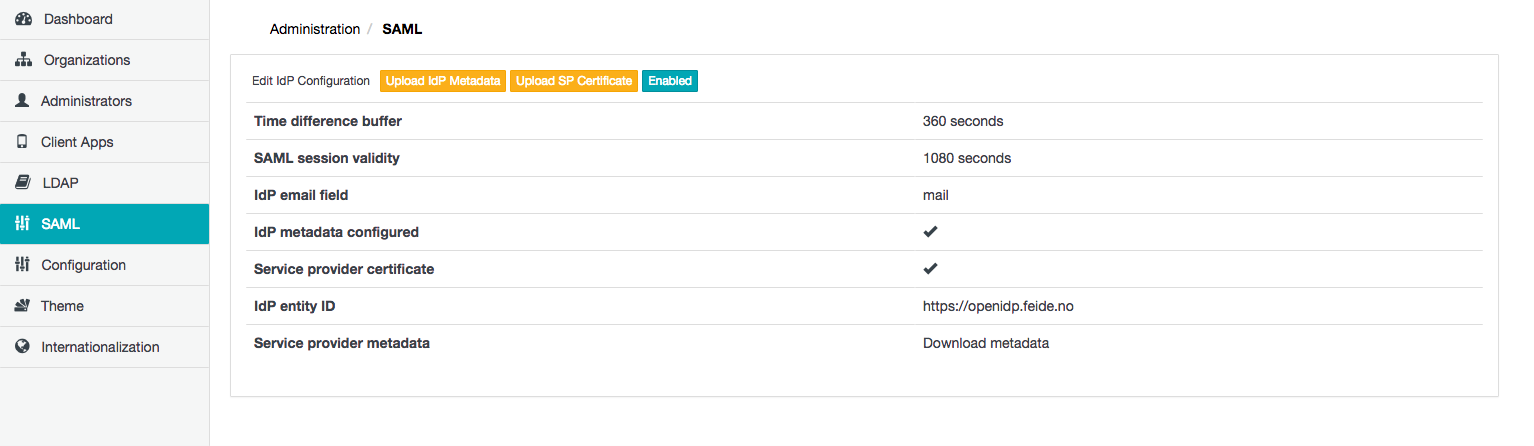 Click Save and the IdP service configuration will appear on the SAML page. Notes: