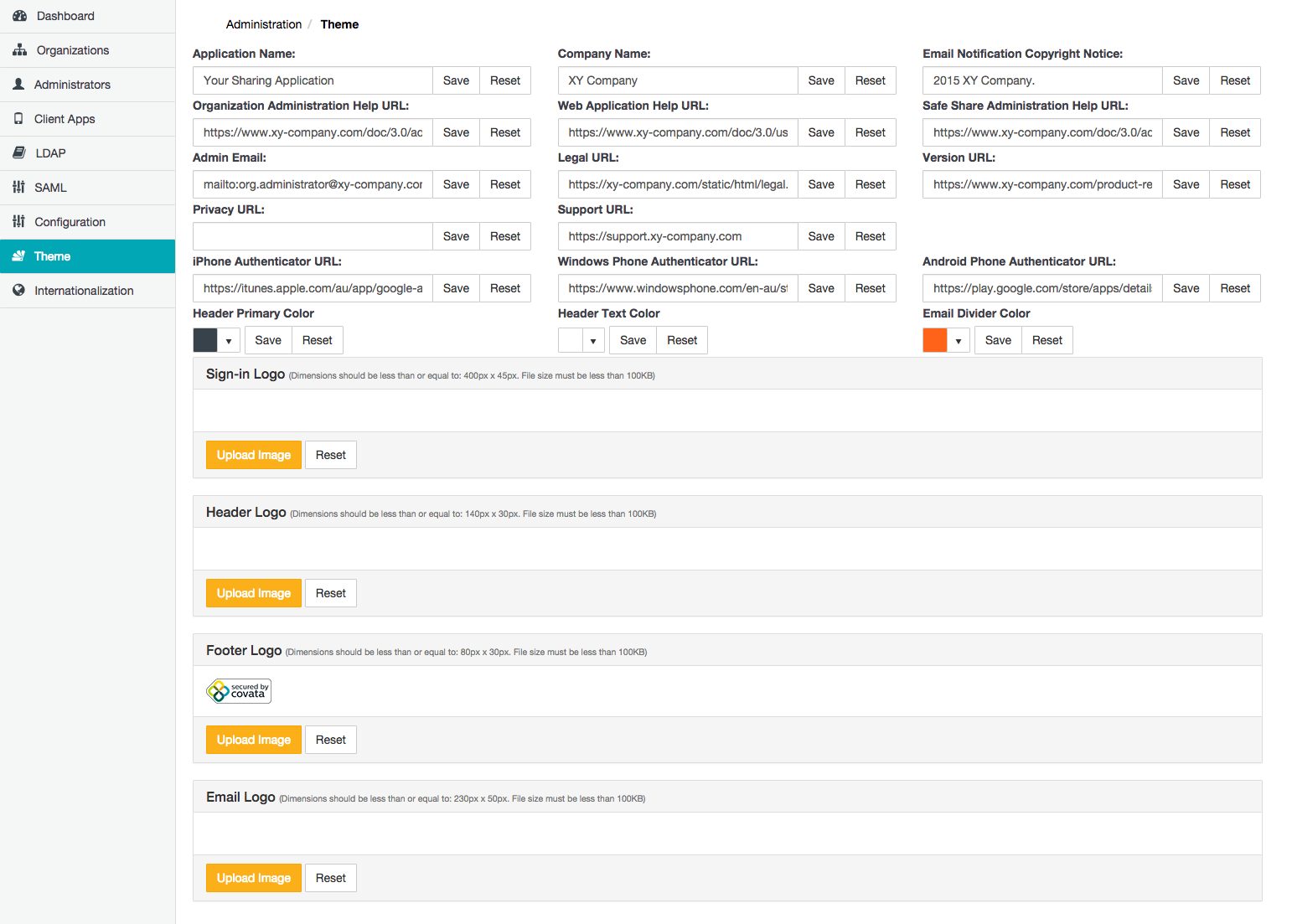 Note: Please be aware that any modifications to any theme properties or user interface logos on this page apply to all organizations configured on the Covata Platform.