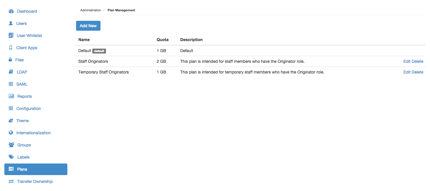 The Plans page allows Covata Platform administrators to define storage quotas, which are used to limit the amount of storage (managed by the Covata Platform's Content Service) available to Covata user accounts accessed through either: