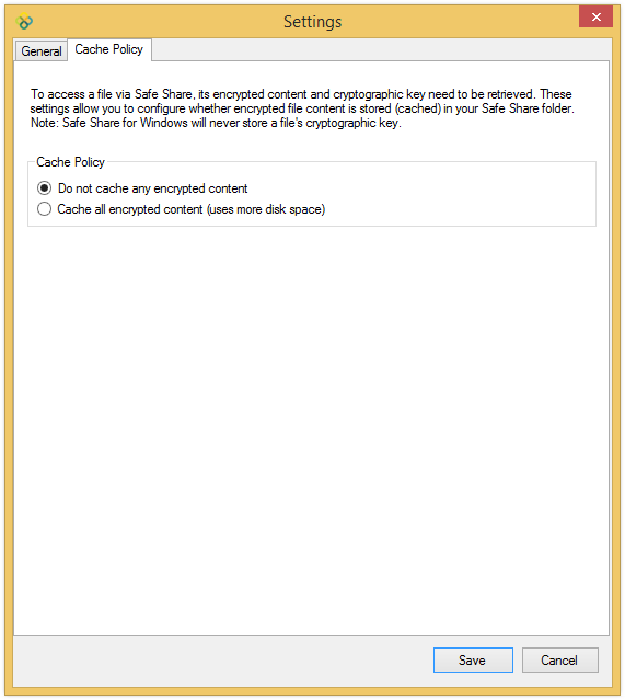 Therefore, the Safe Share for Windows cache policy feature allows a user to define whether or not all encrypted content within the Safe Share folders will be retained and stored (i.e. cached) locally on the computer.