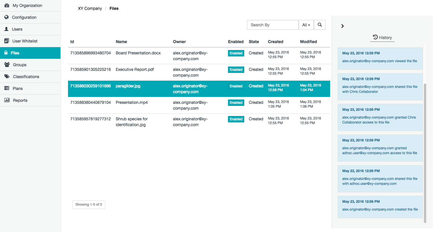The Files page allows Organization administrators to search all files (also known as Secure Objects ** ) within their organization, which have been encrypted using Covata technologies. Using this page, the following activities can be performed on any of these files: