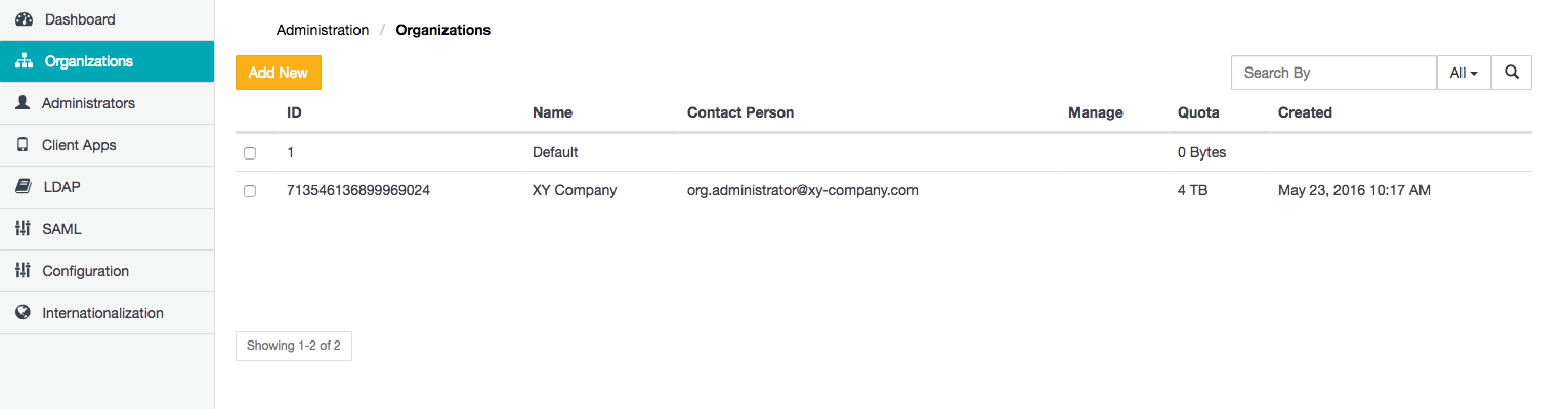 - Filter organizations - In the Search By box (right of the Organizations page), begin typing a series of characters contained in any of the organizations' Name or Contact Person fields, followed by the 'Enter/Return' key. This filters the list of organizations on the Covata Platform to those whose Name or Contact Person contains the subset of characters entered into the Search By box.
