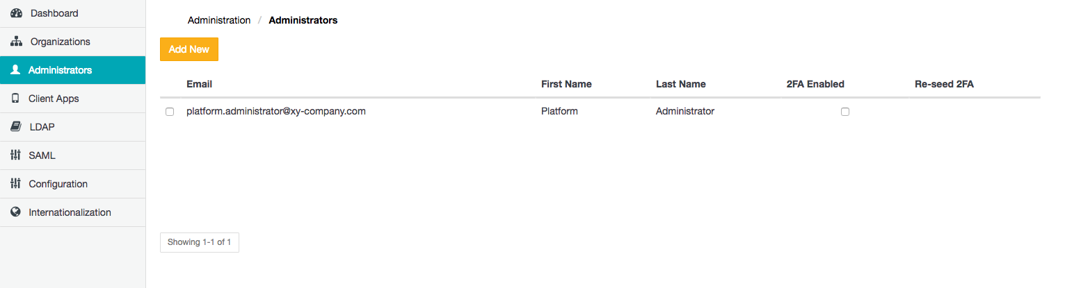 | 2FA Enabled (2) and Re-seed 2FA | The 2FA Enabled field's check box for a Safe Share administrator's account is selected if that user has two-factor authentication (2FA) enabled on their account. (This field is also editable through the user's own My Account feature.) If this check box is selected for a Safe Share administrator's account, then the Re-seed button becomes available for that account in the Re-seed 2FA column/field. If a Safe Share administrator account does not have 2FA enabled, this field's check box is cleared for their account. The state of 2FA being enabled or disabled for Safe Share administrator accounts other than your own is only visible on the Administrators page. | No |