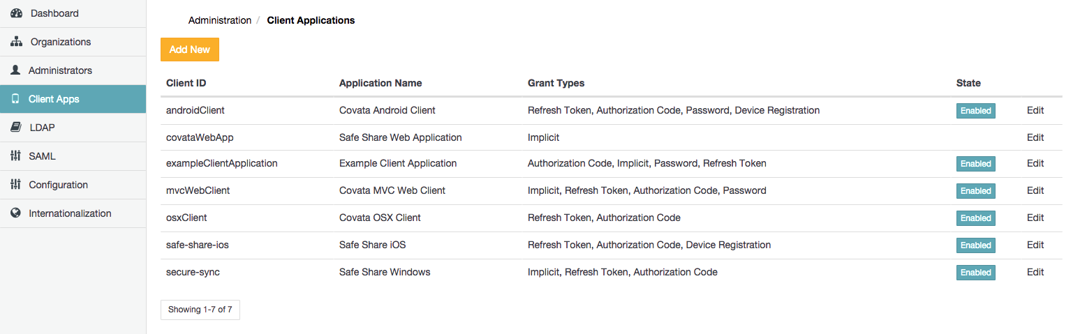 Note: When a client application is disabled it can still be edited. This feature allows a registered client application to be configured before access to the Covata Platform is enabled.