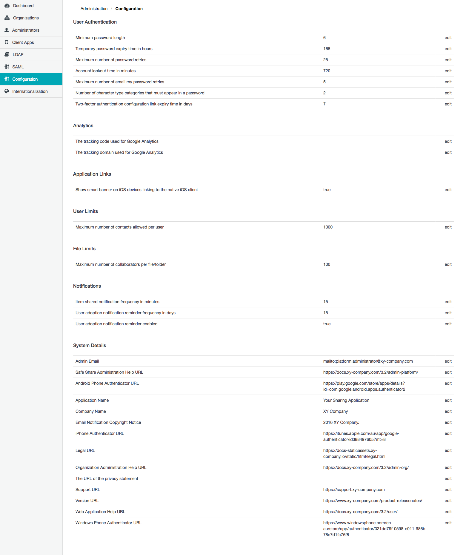 The Configuration page allows Safe Share administrators to modify a restricted set of properties on their Covata Platform instance, which are used to tweak specific functional aspects and the behavior of their Covata Platform instance.