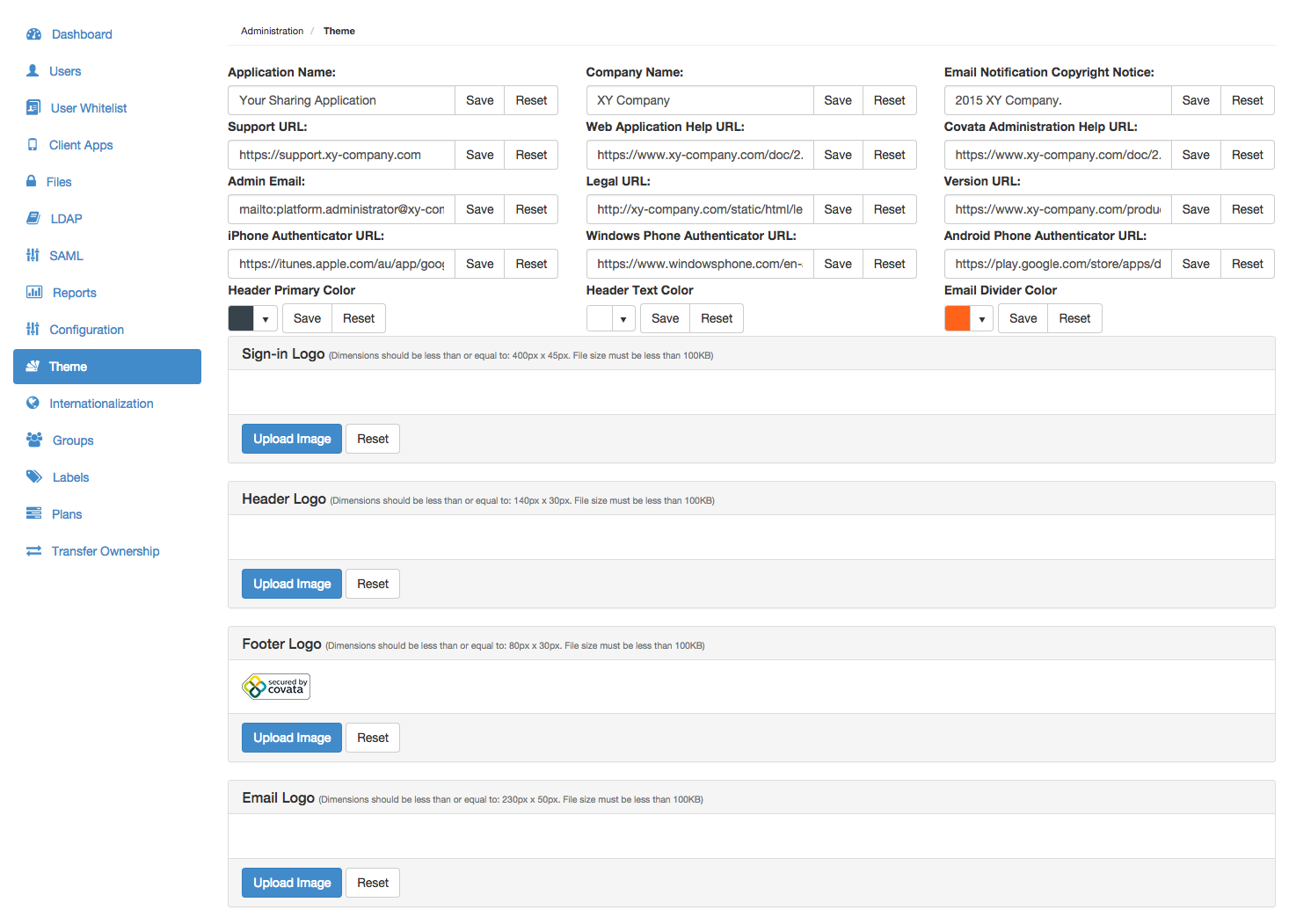 The Theme page allows Covata Platform administrators to modify the: