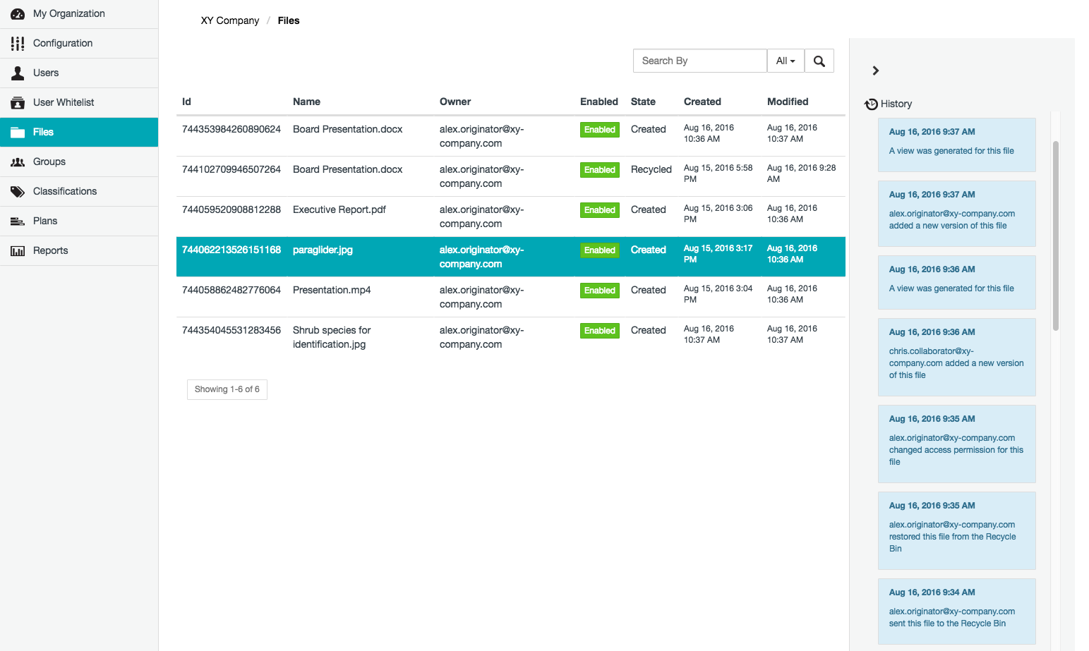- All Organization administrators of the organization in which the file was created. (These activities only include disabling and re-enabling files).