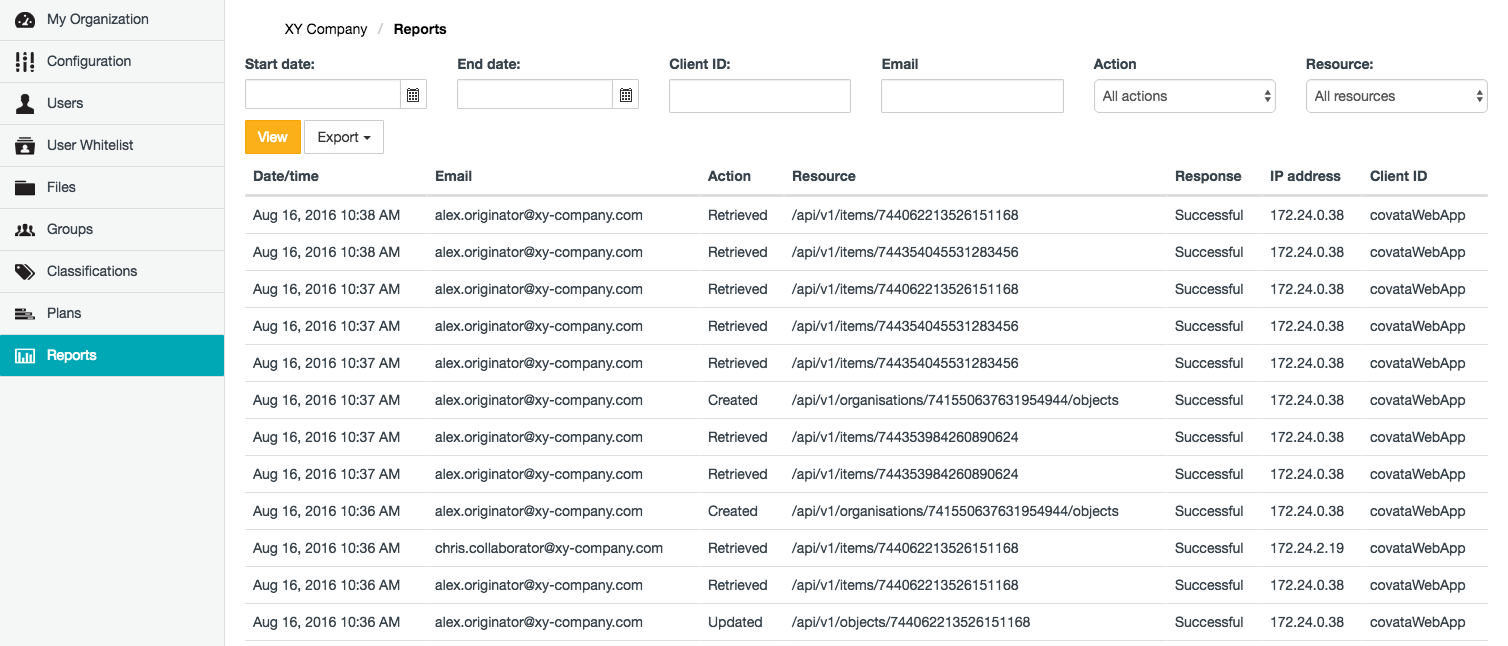 The Reports page allows Organization administrators to access a history of activities performed by any Covata users who are members of the organization.