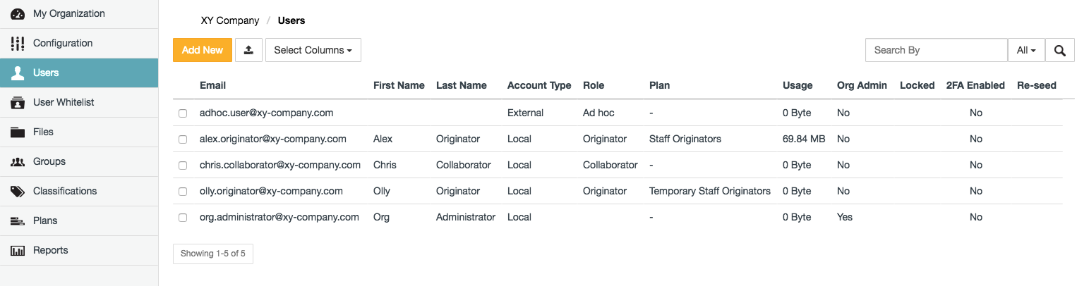 - Is represented by an account which can be added to, edited (2) within, or removed from an organization (and re-added again) by an Organization administrator through the Users page of Safe Share Organization Administration.