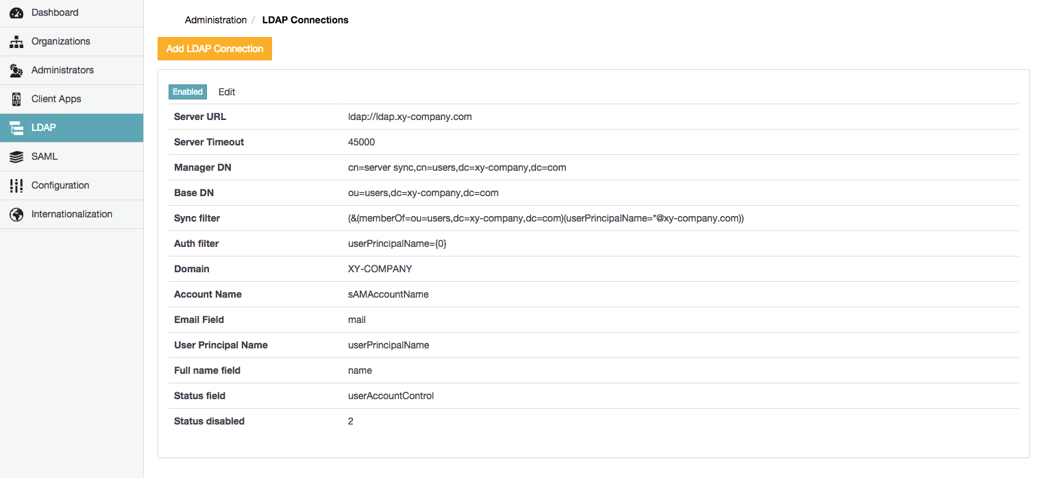 - If you add an organization (resulting in two or more organizations on your Covata Platform instance), then the LDAP feature becomes disabled - i.e. the presence of more than one organization disables this feature. However, the LDAP feature can be re-enabled by removing all except one organization.