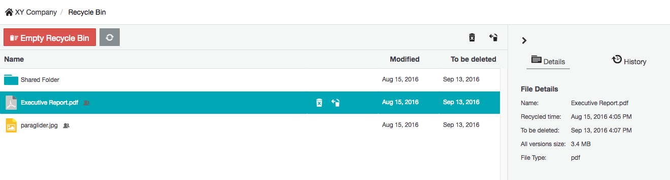 * If a file was shared with a Sharing period specified and subsequently recycled, then upon restoring this file, all collaborators and classification will be removed. This behavior occurs even if this file were located inside a folder that is recycled and then restored.