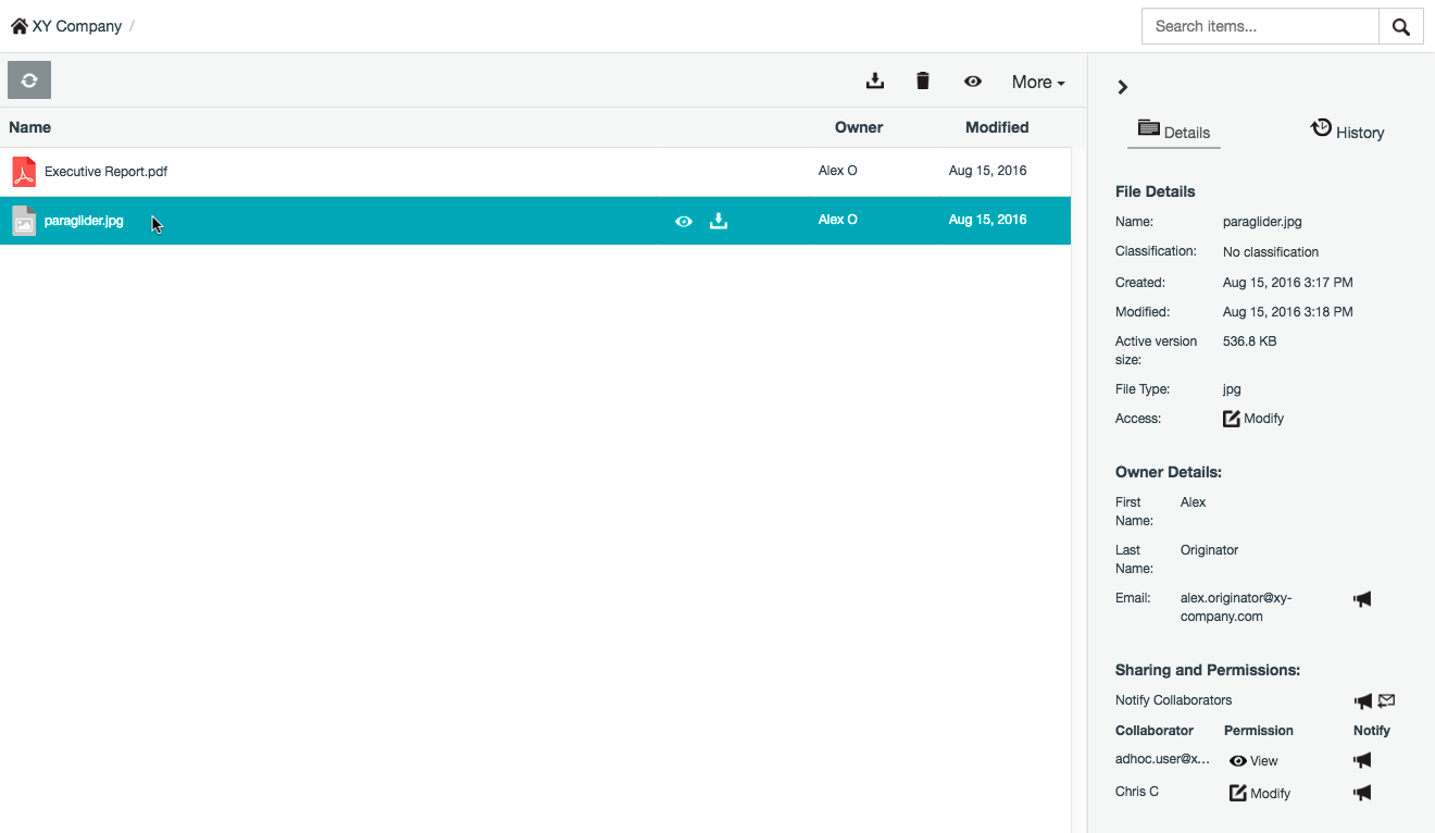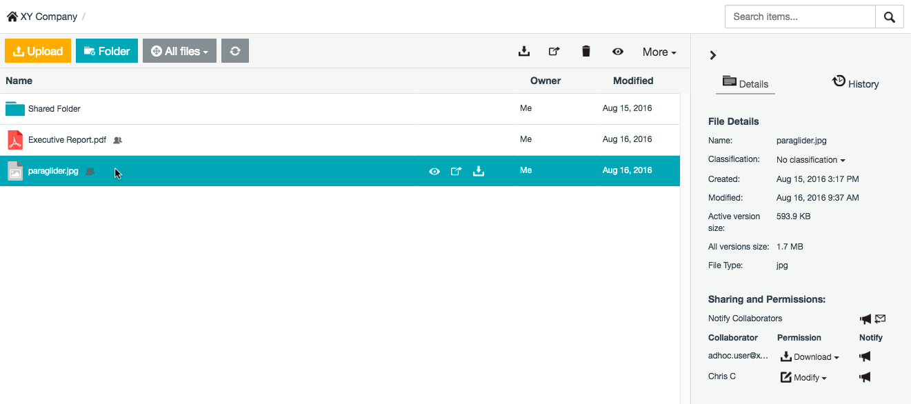 - Select the item from which to remove your access and verify that Access within the File/Folder Details section of the Details tab does not indicate Modify or Manage permissions. Otherwise, proceeding with the next step will instead remove this content.