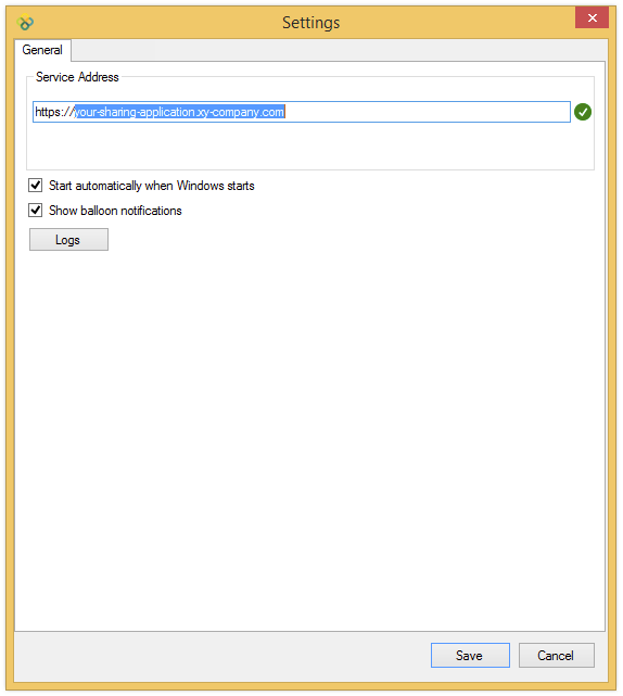 If your computer has just restarted after the installation process, Safe Share for Windows displays the Configure Service Address dialog box to configure your Covata Platform instance (which Safe Share for Windows integrates with to upload your secured data to remote storage, share this data and download data from storage):