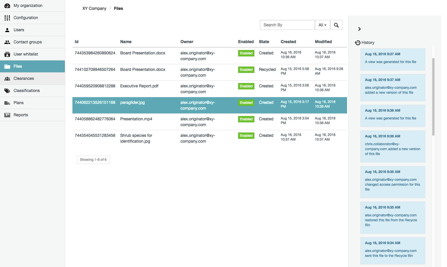 The Files page of Organisation Administration (below) allows Organisation administrators to search all files (also known as file objects or Secure Objects * ) within their organisation, which have been encrypted using Covata technologies. Using this page, the following activities can be performed on any of these files: