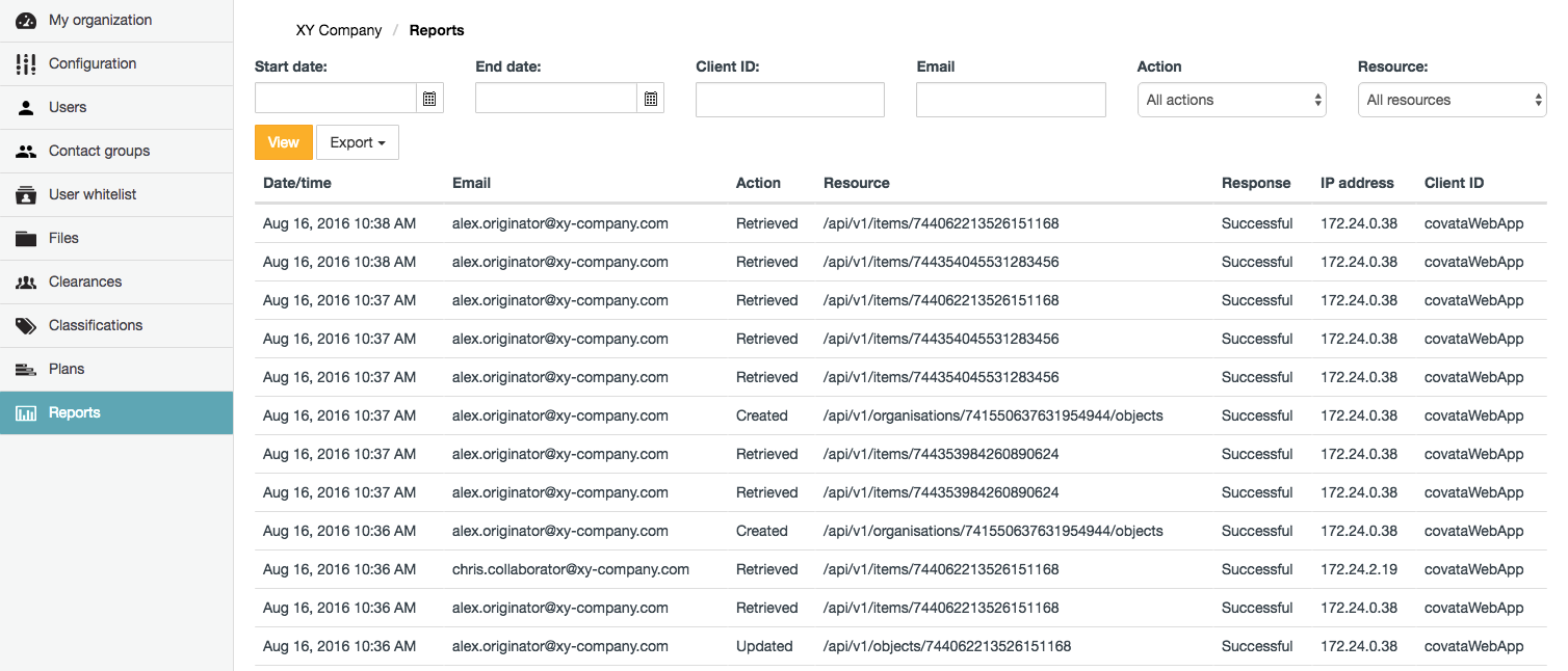Each activity (i.e. 'activity item') on the Reports page represents a request to an endpoint of the Covata Platform API. Each activity on this page consists of the following fields: