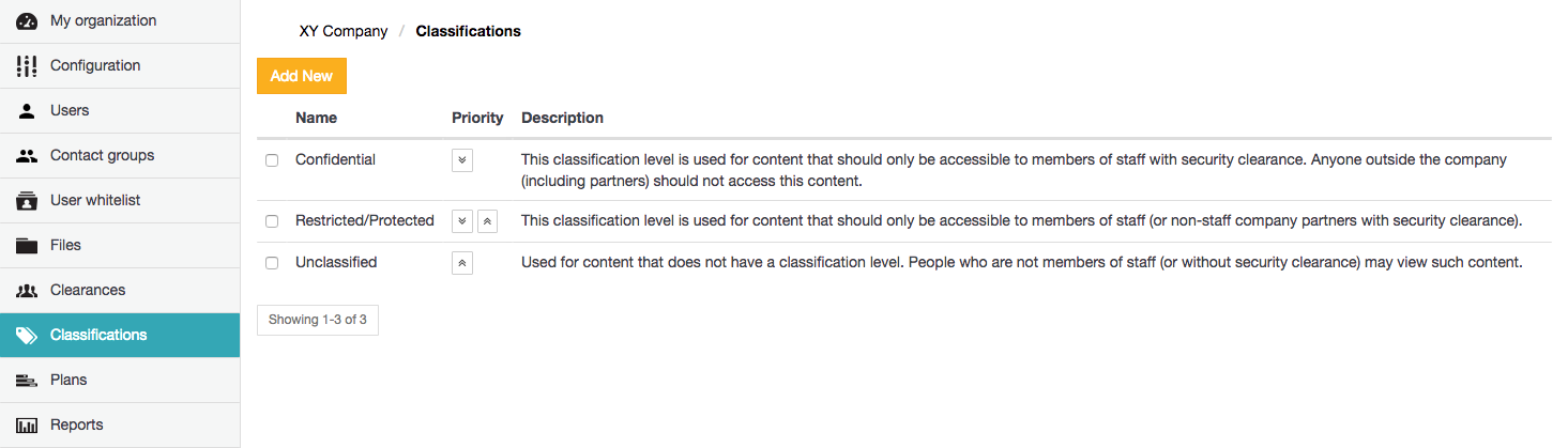 - Click the Classifications option on the left of the SafeShare Organisation Administration interface to open the Classifications page.
