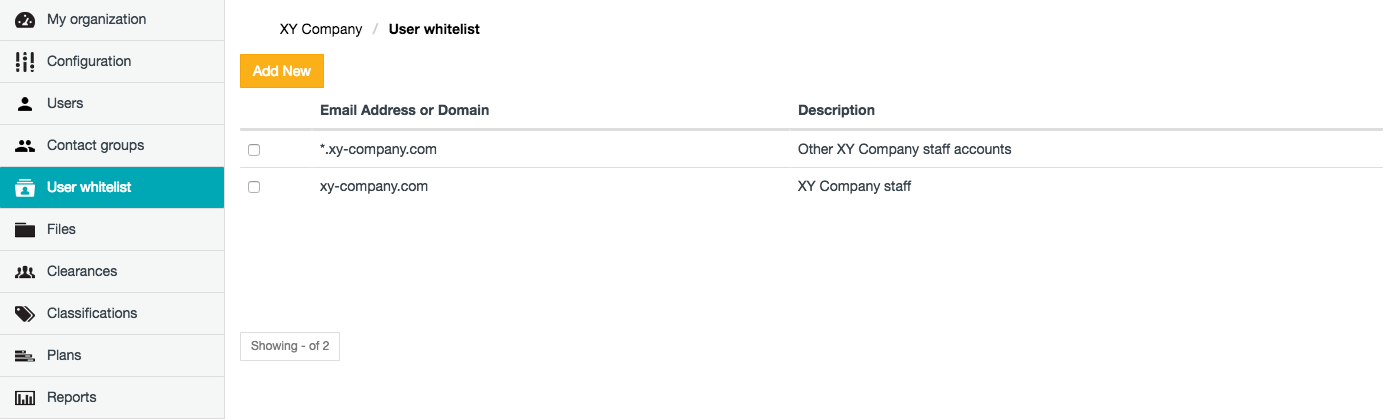 - Click the User whitelist option on the left of the SafeShare Organisation Administration interface to open the User whitelist page.