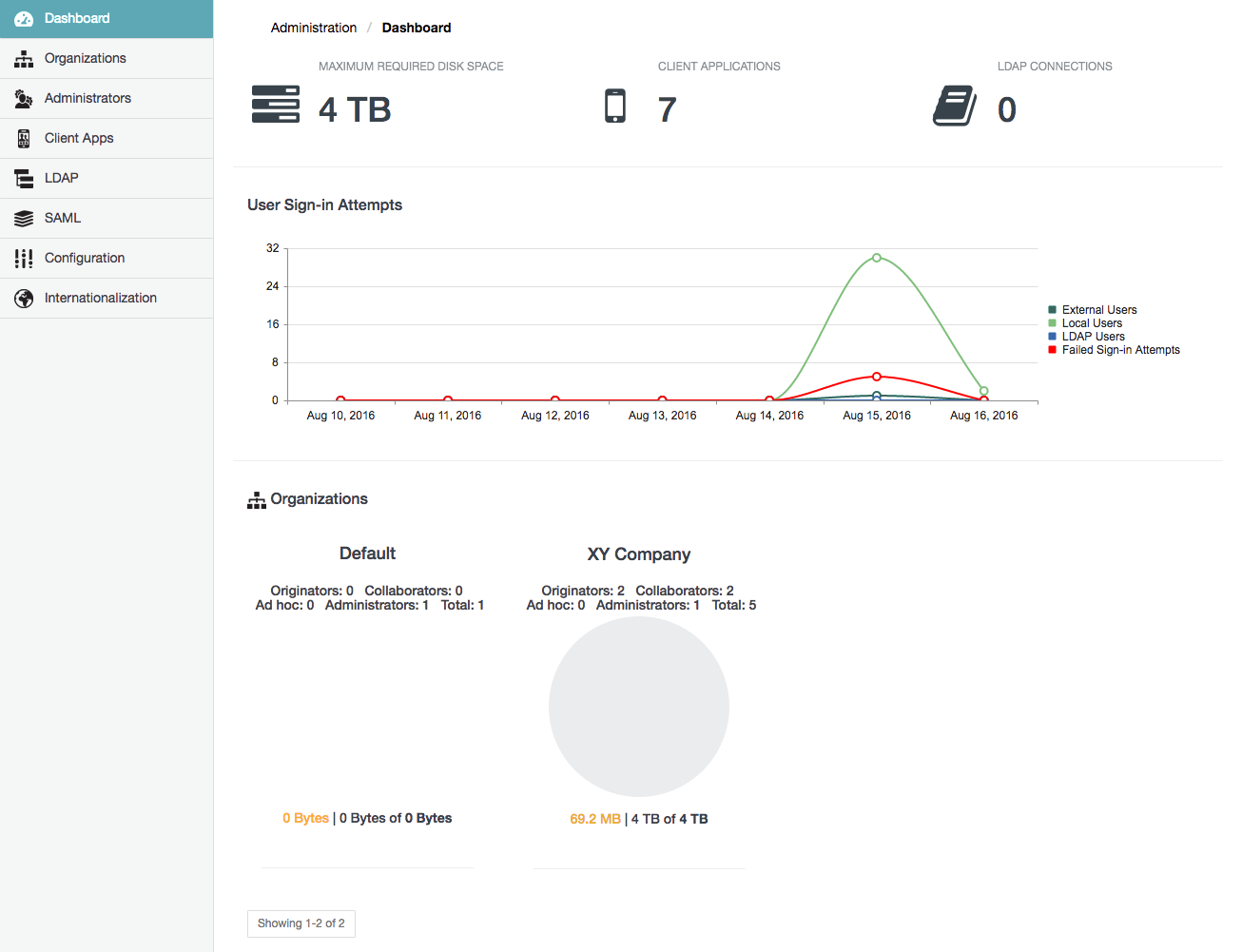 SafeShare Administration is a web-based interface for administering organisations on a Covata Platform instance. This interface also provides access to a number of configurable features of Covata technologies * that apply to all organisations configured on the Covata Platform.