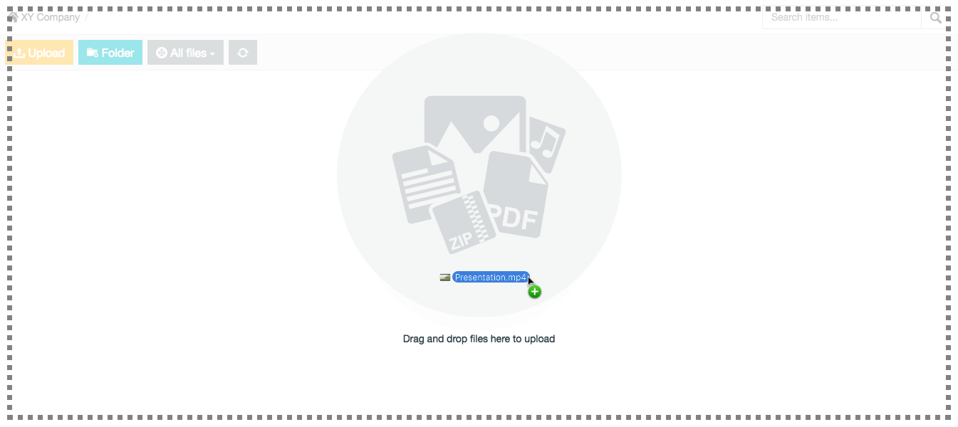 It is also possible to upload one or more file/s to an existing folder by dragging and dropping the file/s on that folder in the items area. The folder highlights a different color to indicate that the files will be uploaded to that folder. See Organising content with folders for more information.